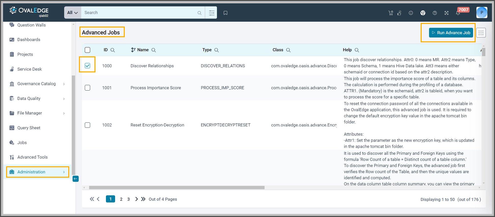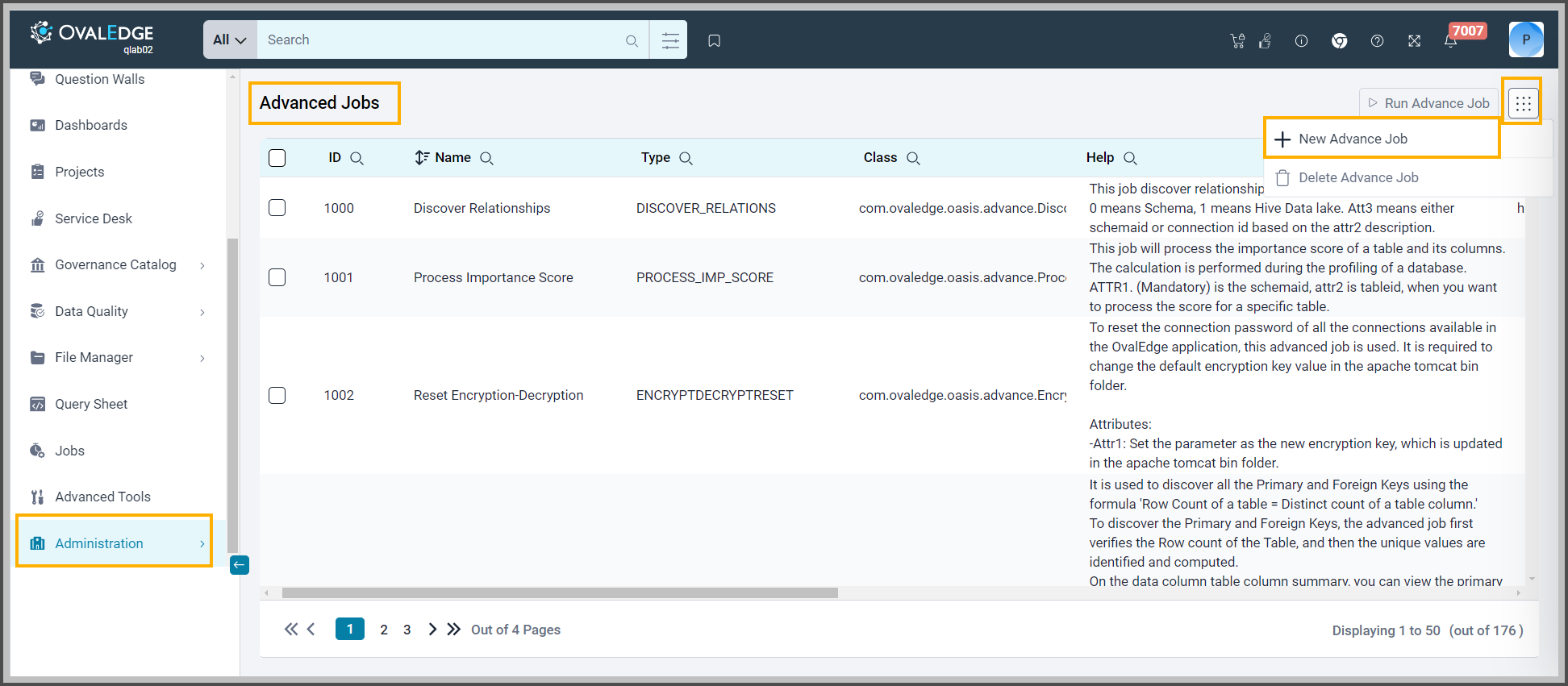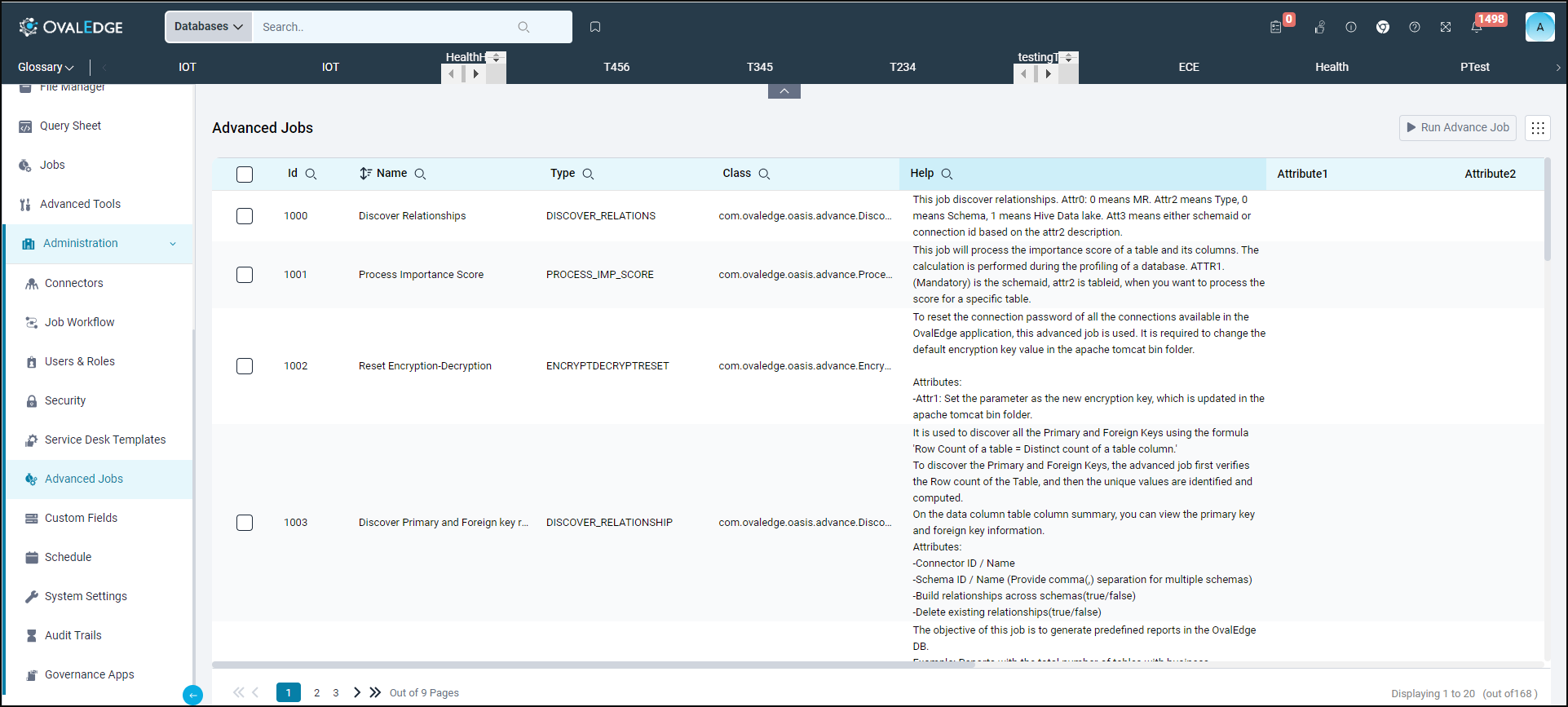 Administrators and authorized users/roles can access the Advanced Jobs by navigating to the Administration module from the left panel menu. The List View displays the list of advanced jobs.