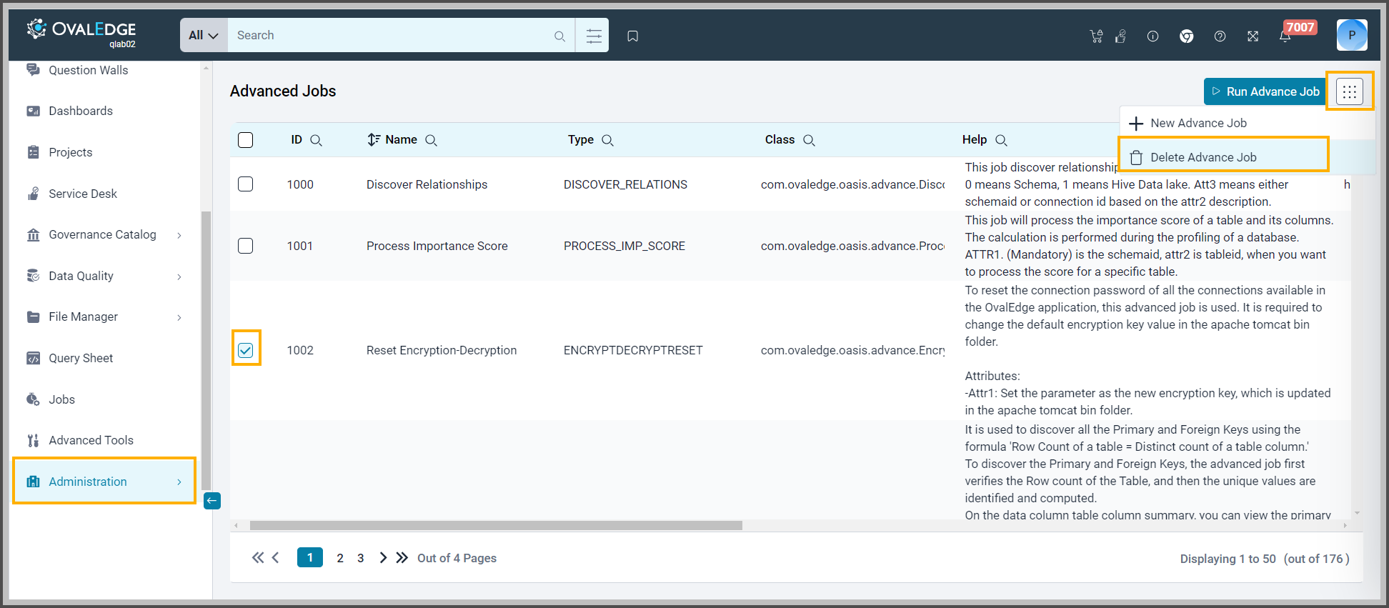 Authorized Roles can delete an Advanced Job by selecting the job and then clicking on the ‘Delete Advance Job’ option in the 9 Dots. They can also delete multiple Advanced Jobs at the same time.