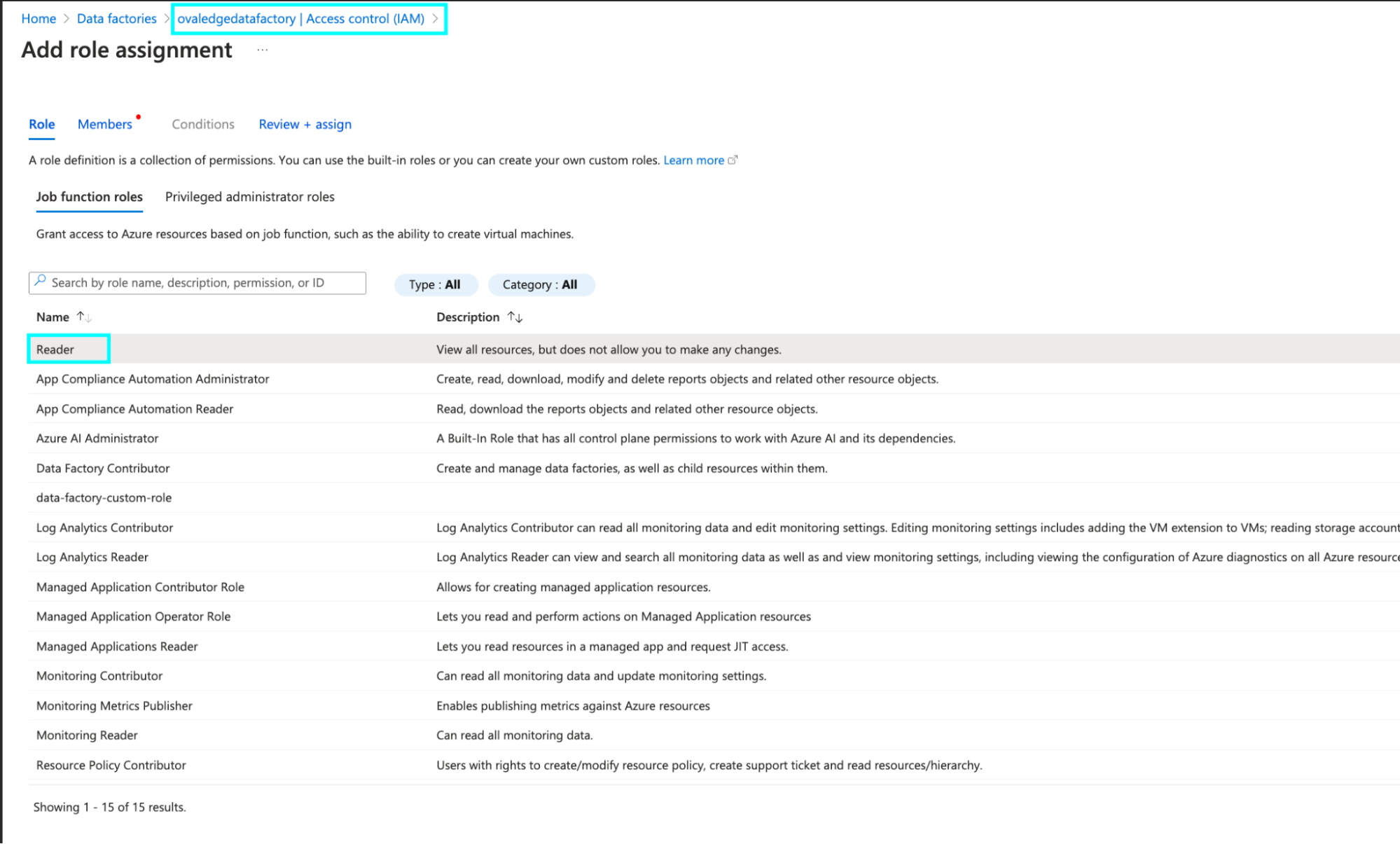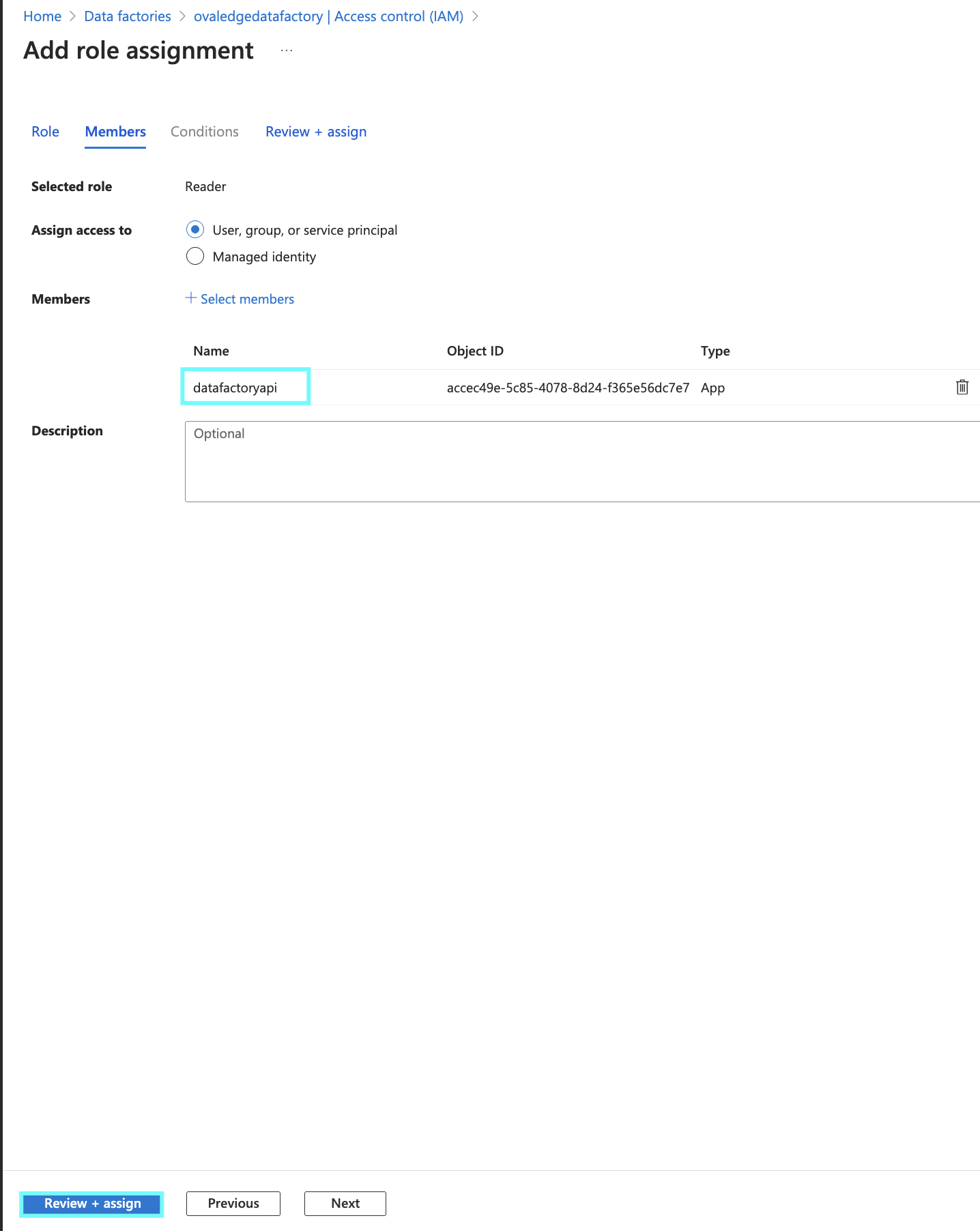Goto AzureDataFacrory> Select the needed DataFactory> Goto Access control (IAM) > click on +Add(Add Role assignment) > Select the permission as Reader > Select the App registration name > then click on Create to grant the permission.