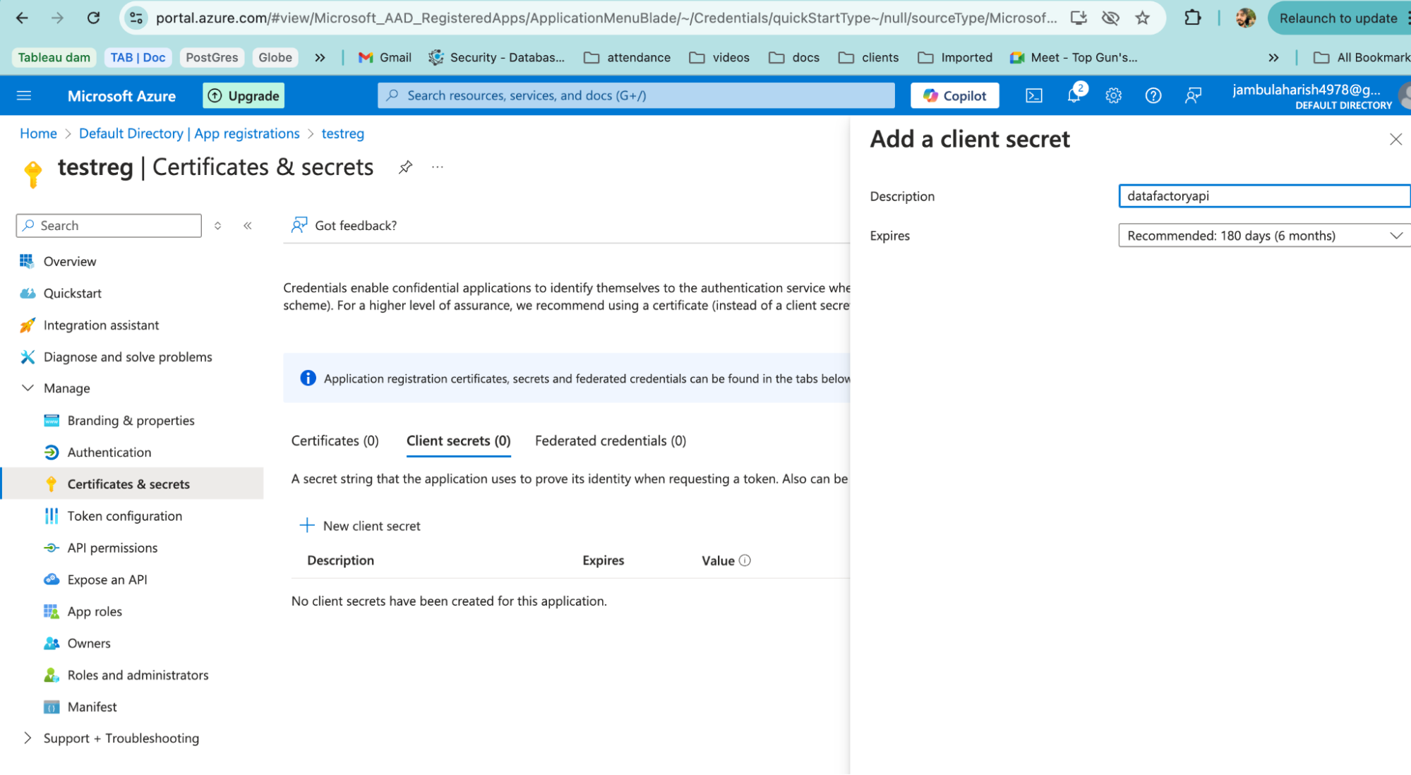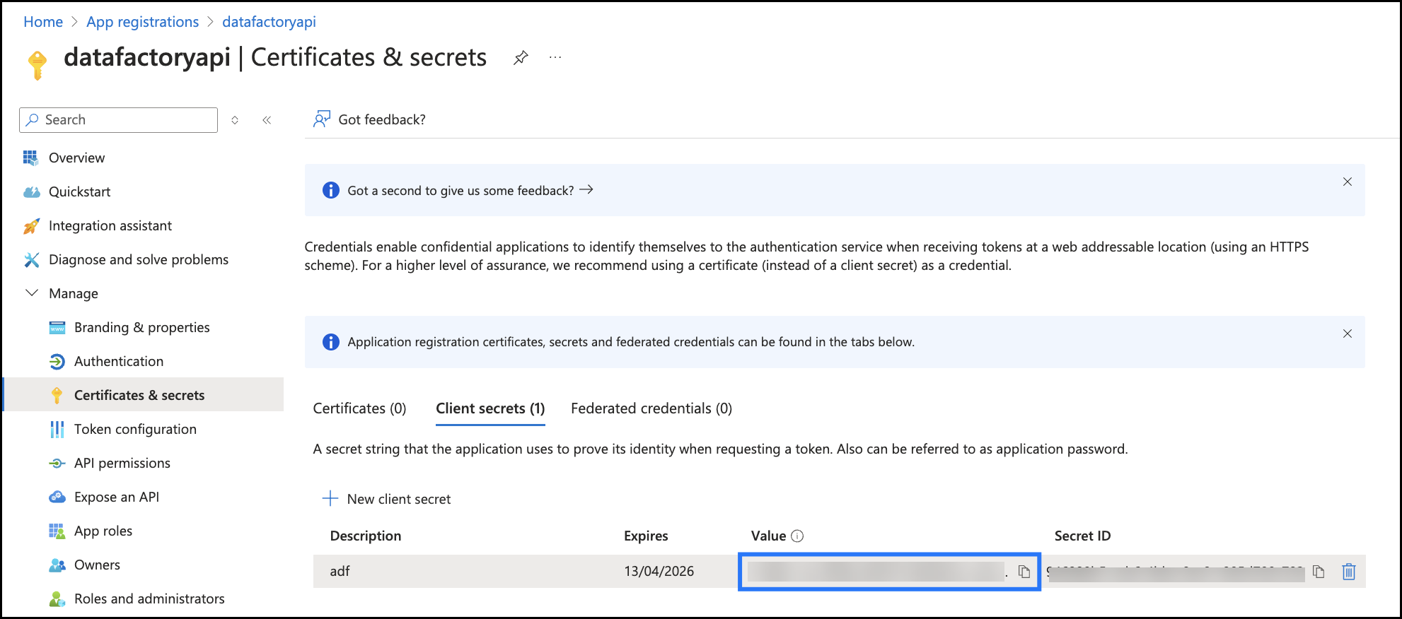 - Then, create a Client ID and Client Secret by navigating to Manage > Certificates and Secrets from the left menu.
