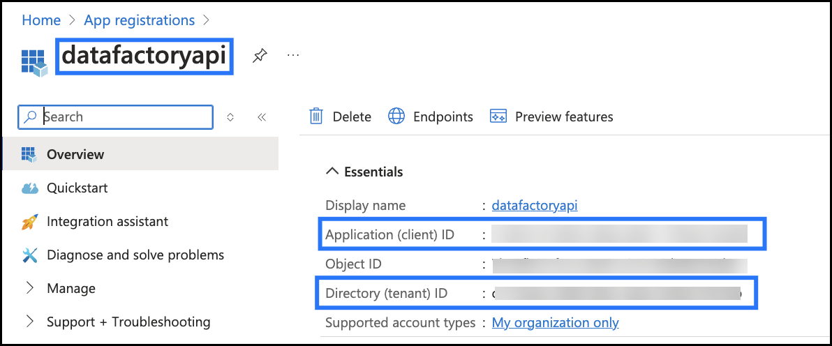 - Note the client ID and tenant ID from the above screenshot.