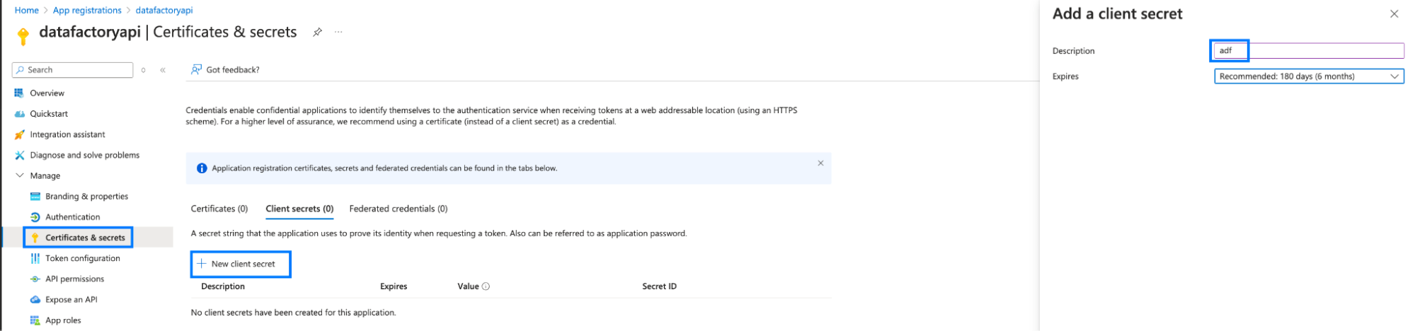 - Click on + New client secret.