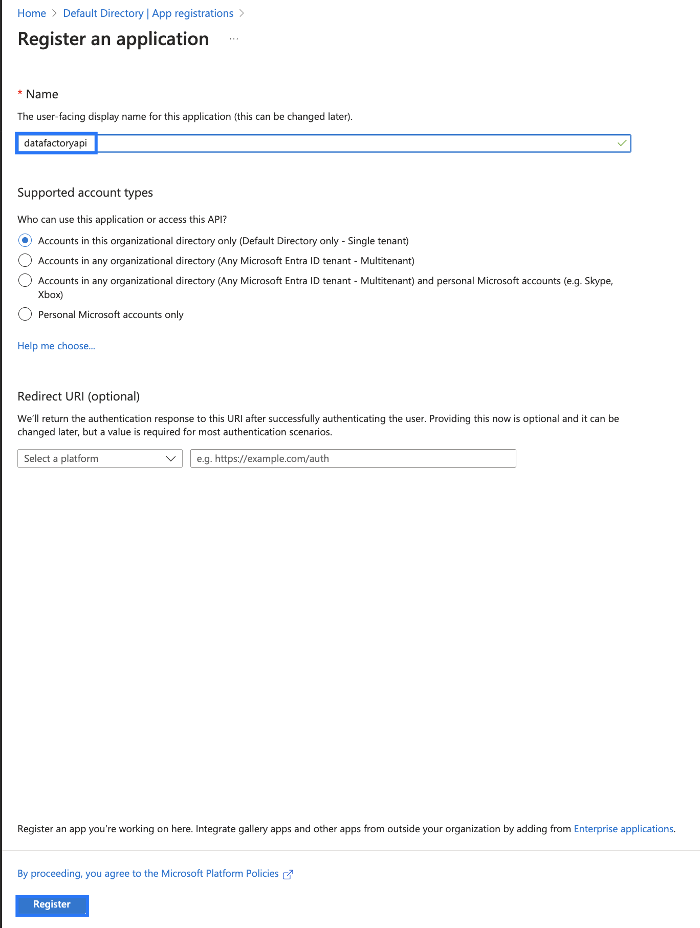 - Register an application - give a user-facing display name for the app, and select the supported account types.